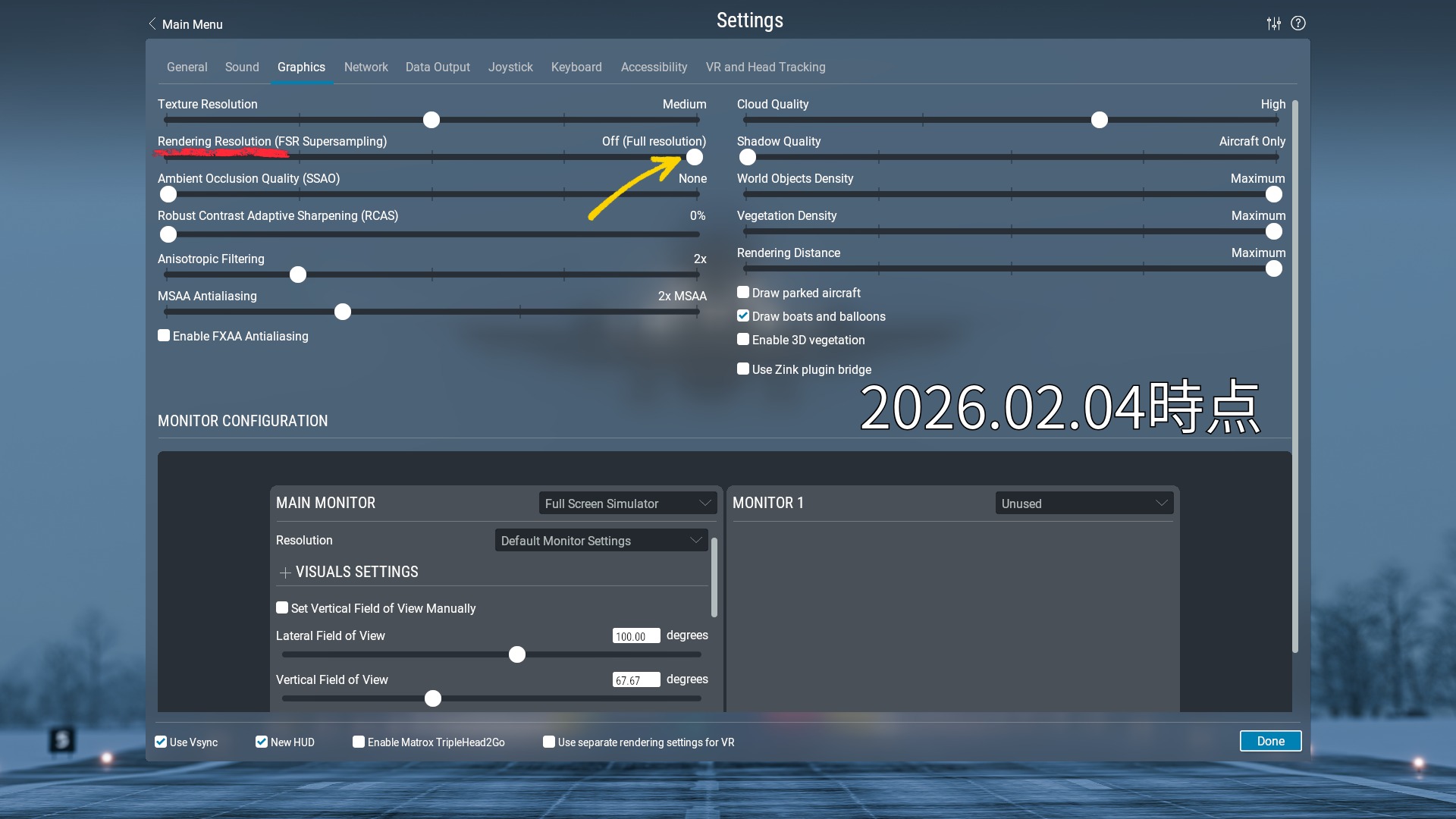 これを左側にすると、視点が動くたびに本来の解像度のものを圧縮する動作がXP12内で増え、グラフィックはぼやけるけど重いという矛盾が起こります。